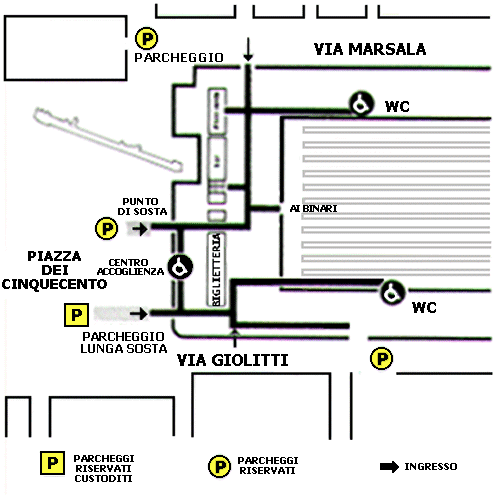 riservati ai lati dell' edificio, su via Marsala e via G. Giolitti. Nel 1990 è stato attivato un servizio di assistenza per i passeggeri disabili, con ufficio ubicato nella hall delle biglietterie, nelle vicinanzedella fermata dei taxi, al quale è possibile rivolgersi per essere agevolati per alcune operazioni di viaggio o per spostarsi all' interno della stazione, mediante l' uso di sedia a ruote. Per informazioni e prenotazioni telefonare ai n. 7617.6245 o 7617.4775. Entro tempi brevi dovrebbe essere istituito un servizio ausiliario per gli spostamenti da e per la carrozza ferroviaria, mediante piccoli mezzi elettrici con tre posti più il conducente. Esistono servizi igienici fruibili anche da persone su sedia a ruote in corrispondenza dei marciapiedi n. 1 e n. 2.